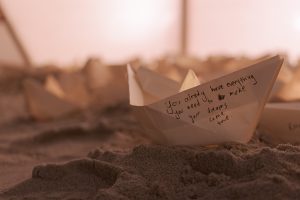 A close up view of an origami boat in the sand. Written on the boat is “You already have everything you need to make your dreams come true.” August 11, 2020